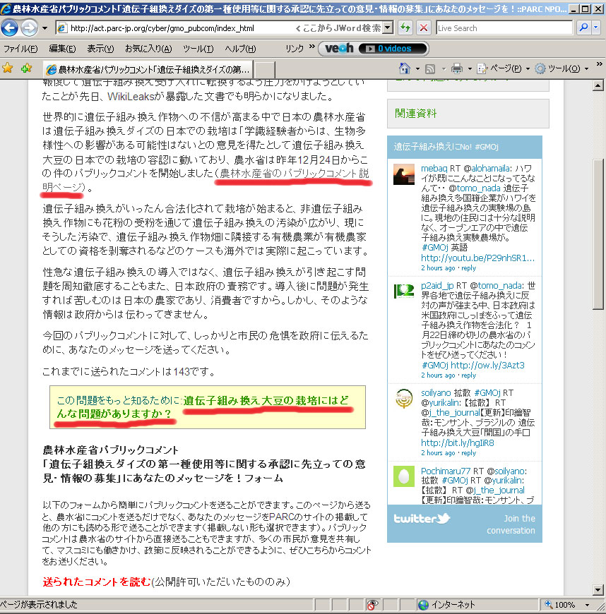 この件についてNPO法人のアジア太平洋資料センター(以降:PARC)が「農林水産省パブリックコメント「遺伝子組換えダイズの第一種使用等に関する承認に先立っての意見・情報の募集」にあなたのメッセージを!」と題してツイッターで広く意見を募集しておりました。